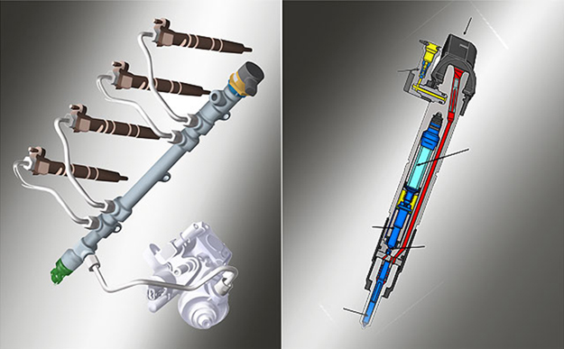 ![]() 上圖為柴油引擎噴射系統圖:左圖是油軌,右圖是噴嘴。柴油引擎不需要有火星塞點火,藉由長衝程壓縮空氣升溫點燃油氣何時該點燃反倒是有噴嘴決定,由於壓電式噴嘴的上市,使得藉由精準控制噴油時機成為可能。反之若是汽油引擎衝程短,不能自行達到燃點,需要靠火星塞點火何時點燃由火星塞決定。 ![]() ![]()